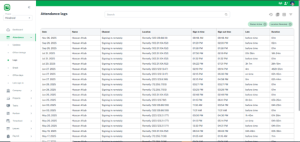 Detailed attendance logs provide historical visibility into working hours, locations, and status changes.