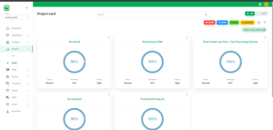 The platform provides structured project management capabilities that allow teams to organize work by project, track progress, and monitor delivery status. Each project includes completion indicators, priority levels, and overall health metrics.