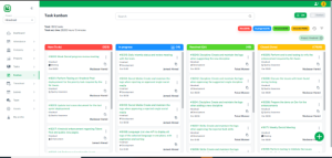 The system offers a visual task management workflow using a kanban-style board. Teams can create tasks, assign owners, set priorities, track progress, and move work through defined stages.