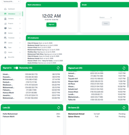 The platform includes a real-time attendance management system that tracks sign-ins, sign-outs, breaks, and remote activity. Managers can instantly see who is working, away, late, or on leave, enabling better workforce planning and accountability.