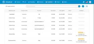 All applications are consolidated into a single view that allows recruiters to review candidate profiles, track application status, capture feedback, and monitor progress across roles.